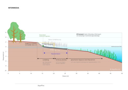 Beispielprofil eines Seeufers vor und nach Revitalisierung im Szenario «INTERMEDIA», also mit Landabtrag und Schüttung ob bestehender Uferlinie zur Ausbildung einer Wasserwechselzone bis auf Niveau Beginn der terrestrischen Vegetation. Grafik: AquaPlus AG