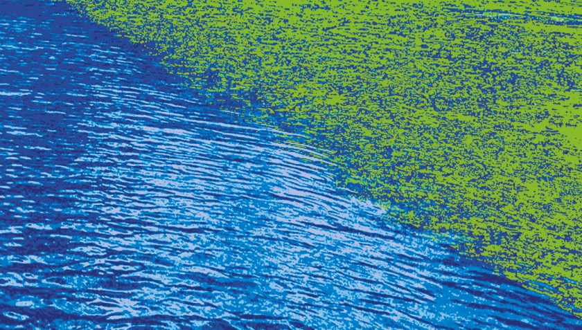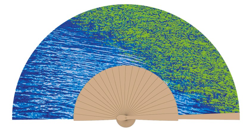 Nachdem wir uns zu unserer diesjährigen Weihnachtsaktion für einen Fächer als «nachhaltigste Klima-Anlage der Welt» entschieden haben, musste noch ein geeignetes Sujet für die Gestaltung der «Luftströmungserzeugungsfläche» oder auch «Windwedelfläche» mit Kühleffekt gefunden werden. Es sollte in irgend einer Form etwas mit unseren Tätigkeiten bzw. Projekten zu tun haben, unsere Logofarben BLAU–GRÜN präsentieren, eine erkennbare Verbindung mit Wasser (= frisch, kühl, …) assoziieren, ein «natürliches» ornamenthaftes Muster darstellen (also trotz realer Quelle nicht gegenständlich sein) … und was der ausufernden Gedanken mehr sind, um sich das Leben im Zuge einer selbst auferlegten kreativen und gestalterischen Herausforderung schwer zu machen.