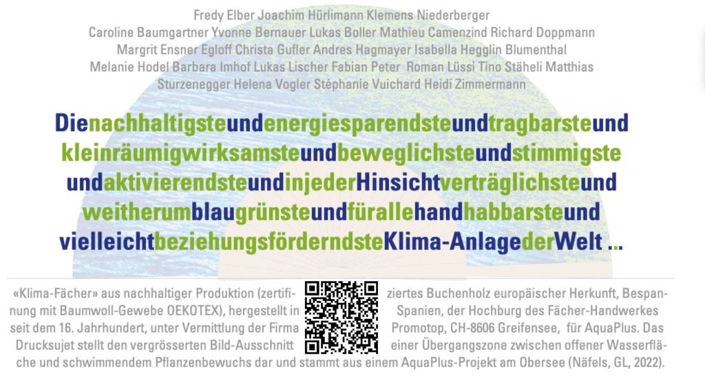 Apropos Obersee (siehe Eingangsbild und Originalvorlage zum Drucksujet des Klima-Fächers): In diesem Gewässer, nahe bei Näfels im Kanton Glarus, untersuchen wir seit längerer Zeit die Entwicklung und Dynamik der Wasserpflanzenbestände, unter anderem auch im Kontext der Auswirkungen auf die fischereiliche und touristische Nutzung. Dabei sind wir auch taucherisch unterwegs mit periodischer Erfassung der immer gleichen Seegrundabschnitte hinsichtlich Bewuchsdichte, Artenzusammensetzung, Häufigkeiten der einzelnen Arten, Untergrundbeschaffenheit und vieler weiterer Aspekte. Mit Hilfe unserer eigens entwickelten und seit über 20 Jahren praktizierten Methodik der systematischen Vegetations- und Untergrunderhebung in stehenden Gewässern (… Methode zur Erfassung der submersen aquatischen Vegetation plus weiterer Parameter, Abkürzung: «MESAV+», publiziert in Aqua&Gas im Jahr 2014) sind wir in der Lage, hinsichtlich verschiedener Fragestellungen quantitative Auswertungen vorzunehmen und die Entwicklung und das «Verhalten» dieses aquatischen Ökosystems zu analysieren, zu beurteilen, zu prognostizieren und auch geeignete Massnahmen im Naturmanagement vorzuschlagen … oder auch auf einem breiten Erfahrungshintergrund von ungeeigneten abzuraten. Für Auskünfte zu unseren Aktivitäten und Projekten zum Thema stehende Gewässer und Wasserpflanzen – und weiteres mehr – stehen wir gerne zur Verfügung.