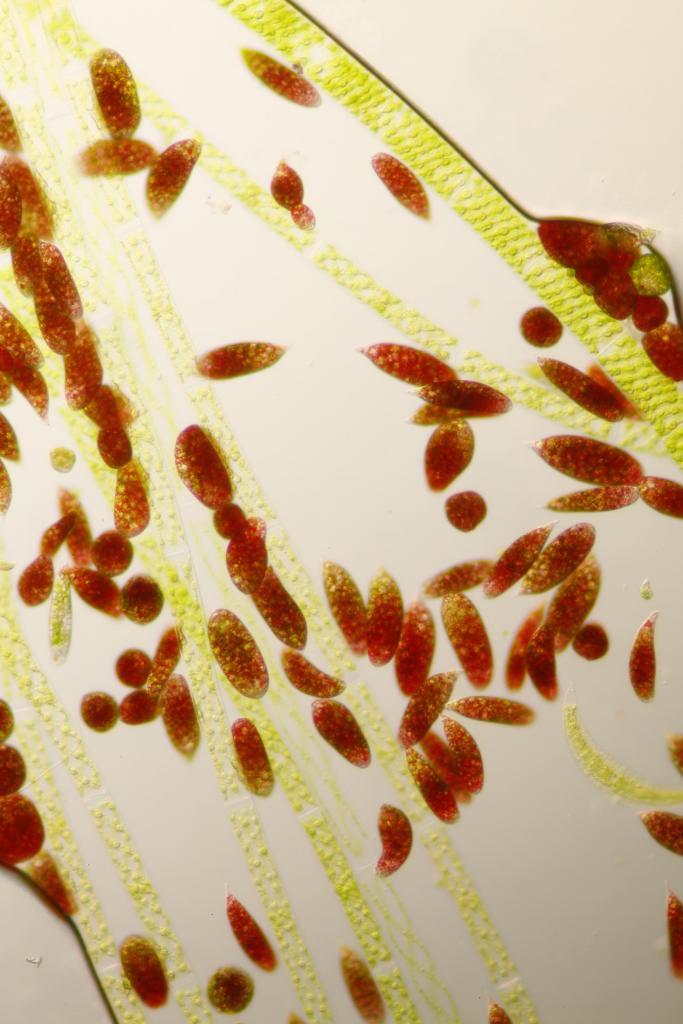 Unter dem Mikroskop kommt man dem Mysterium näher.Die rote Farbe kommt vom Roten Augentier (Euglena sanguinea). Daneben die fädige Jochalge Spirogyra sp. die aber nichts mit dem Rotphänomen zu tun hat.