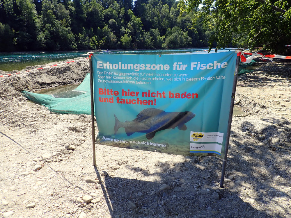 - Schaffung von temporären Beschattungs- und Deckungsstrukturen: Temporäre Strukturen, wie künstliche Abdecknetze und Ausbaggerung künstlicher Kaltwasserzonen können in bestimmten Bereichen umgesetzt werden. Solche Strukturen werden von Fischen als Refugien genutzt und sie können so kritische Perioden überstehen. Temporäre Strukturen sollte stets von einem Massnahmepaket zur Reduktion von Störungen (Informationstafel, Absperrung, Kontrolle durch Fischereiaufsicht) begleitet werden.